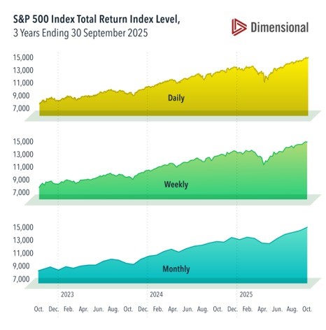 One way to see this clearly is by looking at how returns appear over different time frames. Daily returns can look like a rollercoaster, full of sharp peaks and troughs. But as you zoom out to weekly or monthly returns, the picture becomes much smoother. What once seemed like dramatic drops—such as those in the third quarter of 2023 or April 2025—begin to look like minor blips in an otherwise upward trend.